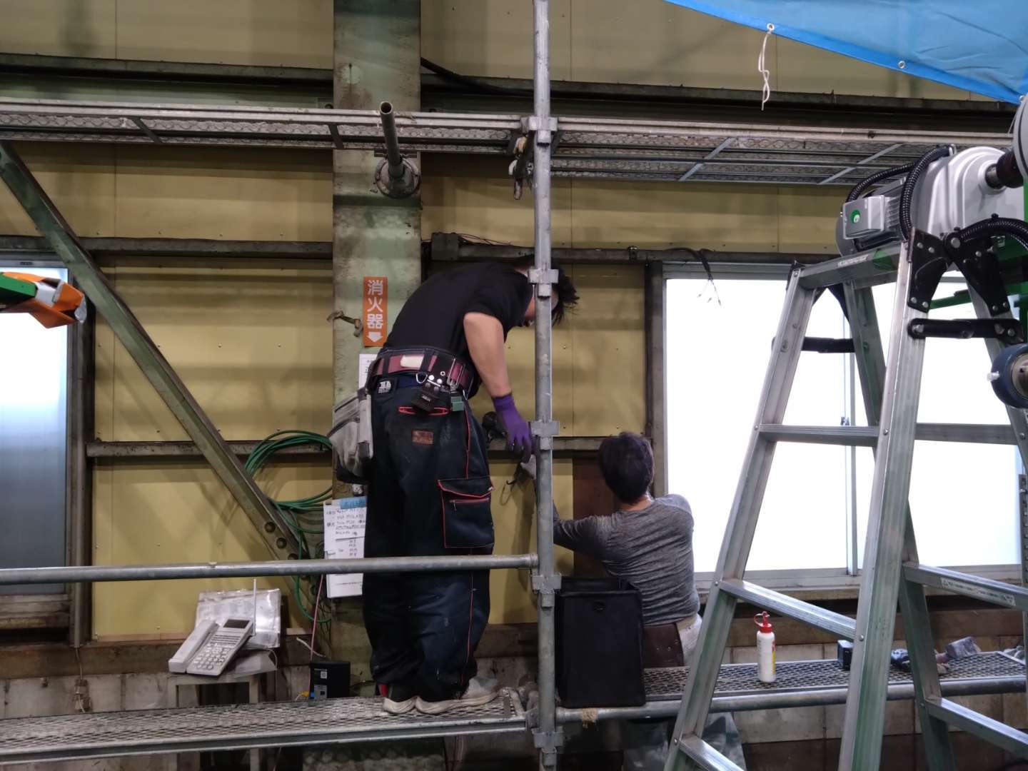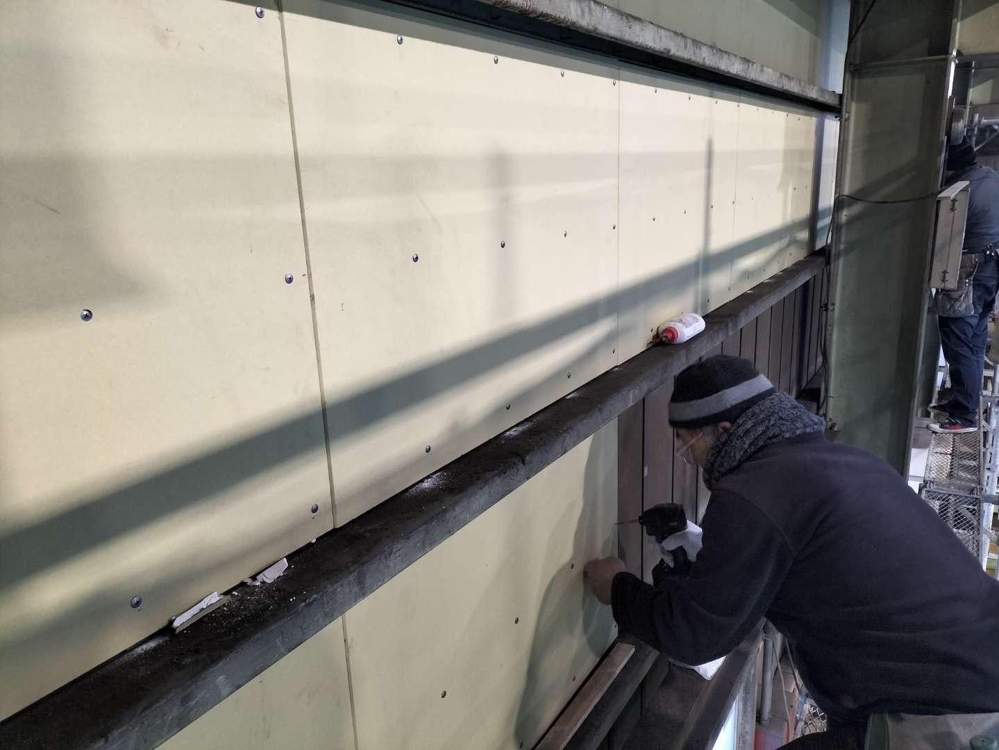 作業足場を掛け、シート養生等を行い、ビスや、ボンドにてボード貼り施工となります。