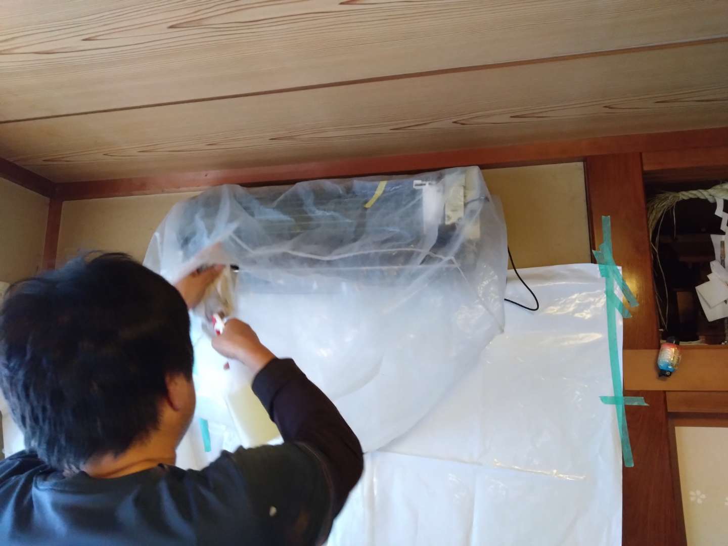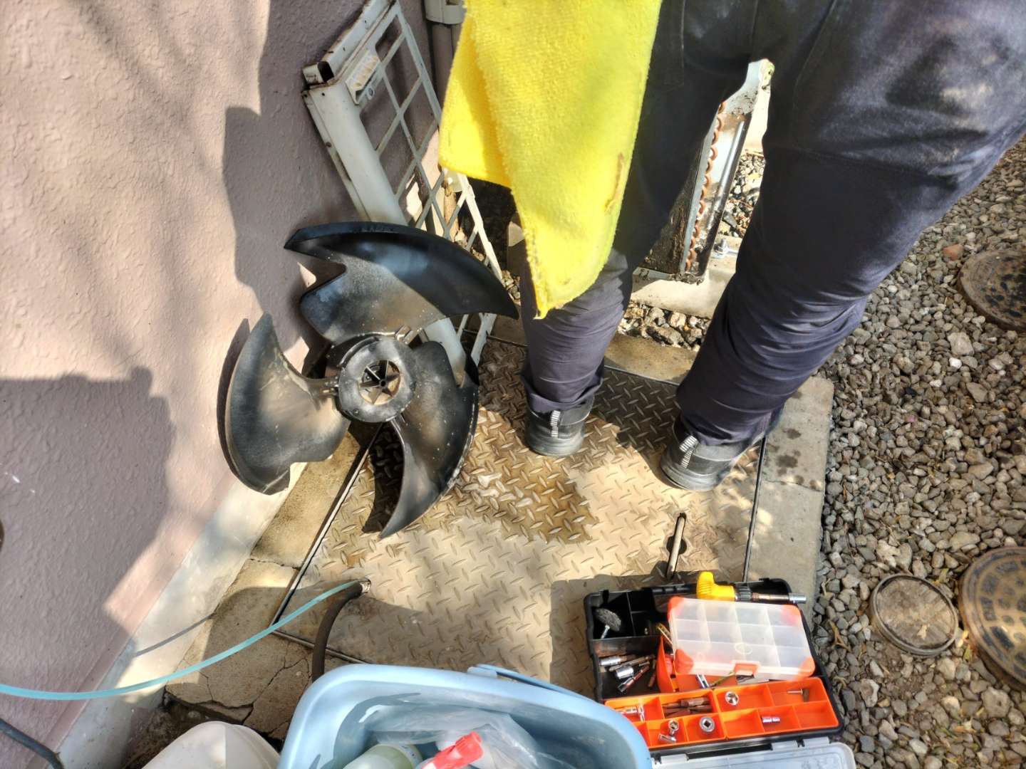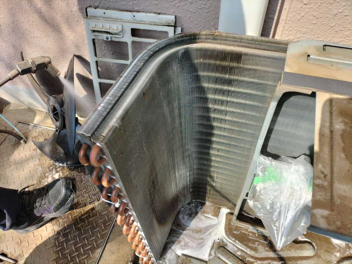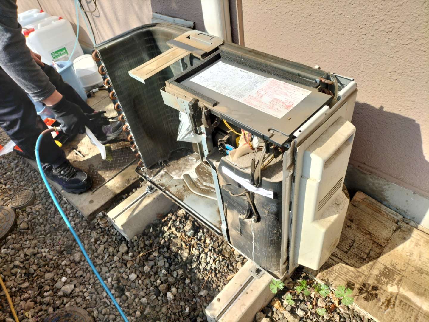施工方法は、室外機の外カバー外し、プロペラなどの部品を外し、水が濡れてはダメな所や危険な所に養生やカバーを行い作業します。